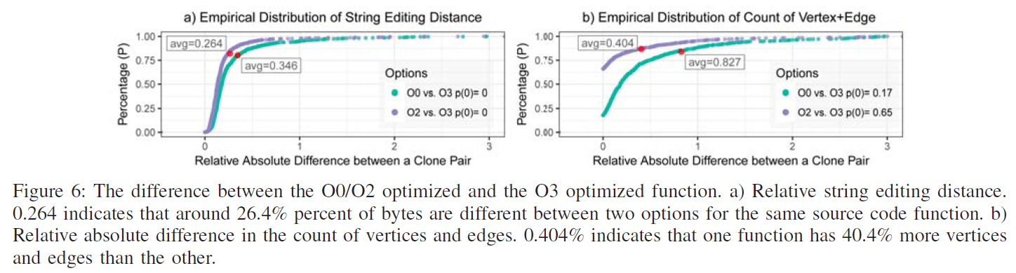 b)를 확인해보면, 최적화를 다르게 하였을 때, CFG가 100% 동일한 경우는 O0 vs O3의 경우 17%, O2 vs O3의 있었고, 평균적으로 O0최적화와 O3최적화를 비교하였을 때는 82.7%의 차이가 났고, O2와 O3를 비교하였을 때는 40.4%의 차이가 났다.
