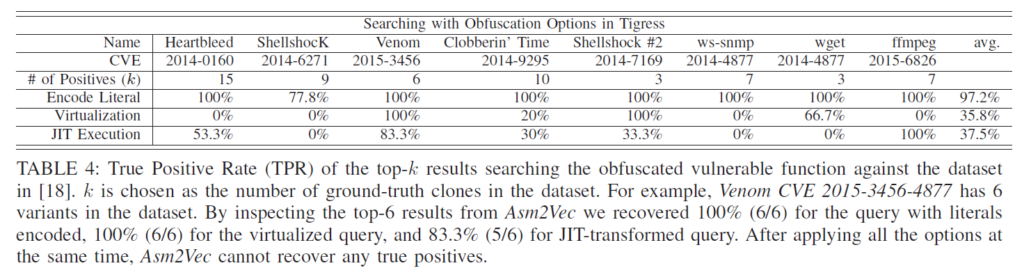 최적화 옵션을 다르게 하거나, 난독화를 하였을 때도 Asm2Vec을 이용하면 Clone search를 해낼 수 있다는 점에서 아주 강력한 Clone search 방법이라는 것을 시사한다.