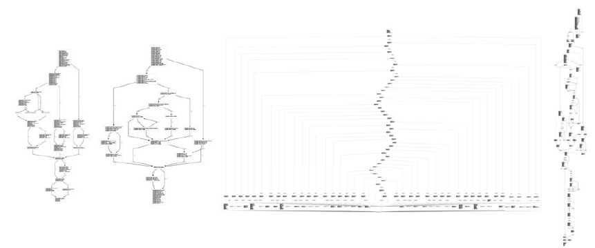Figure 1: Different assembly functions compiled from the same source code of gmpz tdiv r 2exp in libgmp. From left to right, the assembly functions are compiled with gcc O0 option, gcc O3 option, LLVM obfuscator Control Flow Graph Flattening option, and LLVM obfuscator Bogus Control Flow Graph option. Asm2Vec can statically identify them as clones. 이처럼, Clone Search를 하는 건, 어려운 문제이고 연구할 만한 가치가 있다. (그래서 Asm2Vec을 만들었다!)