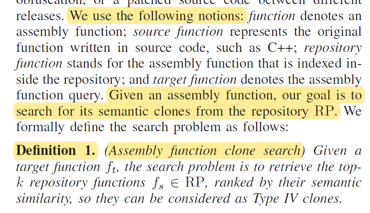 이 논문의 목표는 주어진 assembly function에 대해서 semantic clones를 repository RP에서 찾는 것이다. 즉, target function의 Type IV Clone을 repository에서 찾는 것이다. (Assembly function clone search)