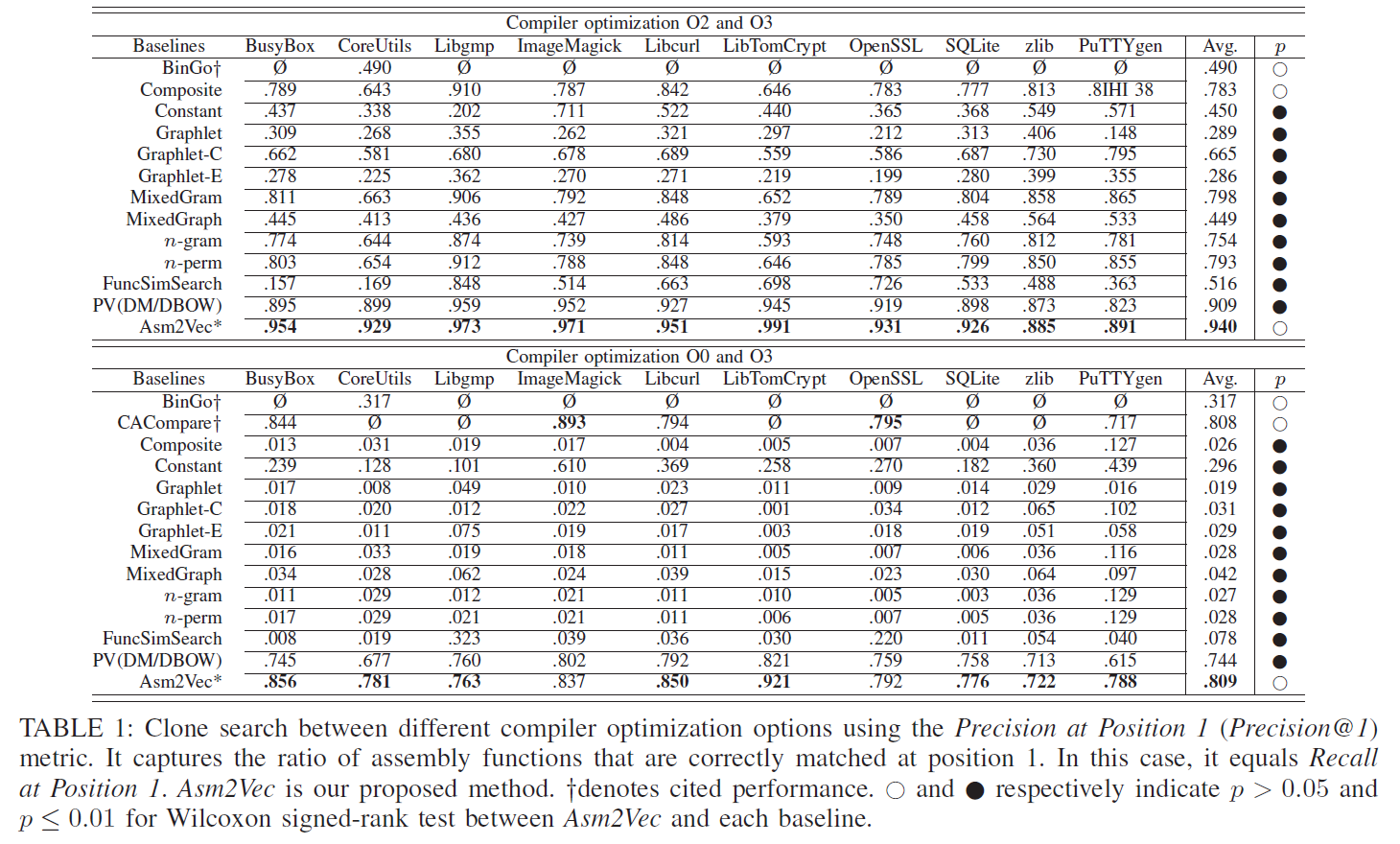 위 논문은 결국 어셈블리 instruction을 Word2Vec처럼 어셈블리를 벡터로 표현하여 모델을 구현하고 학습시킬 수 있다는 것을 설명하며, 이를 이용하게 되면 난독화되어 있거나 컴파일러 최적화 옵션이 달라도 우수한 성능으로 code clone을 정적분석으로 검색해낼 수 있다는 내용을 다루고 있다.