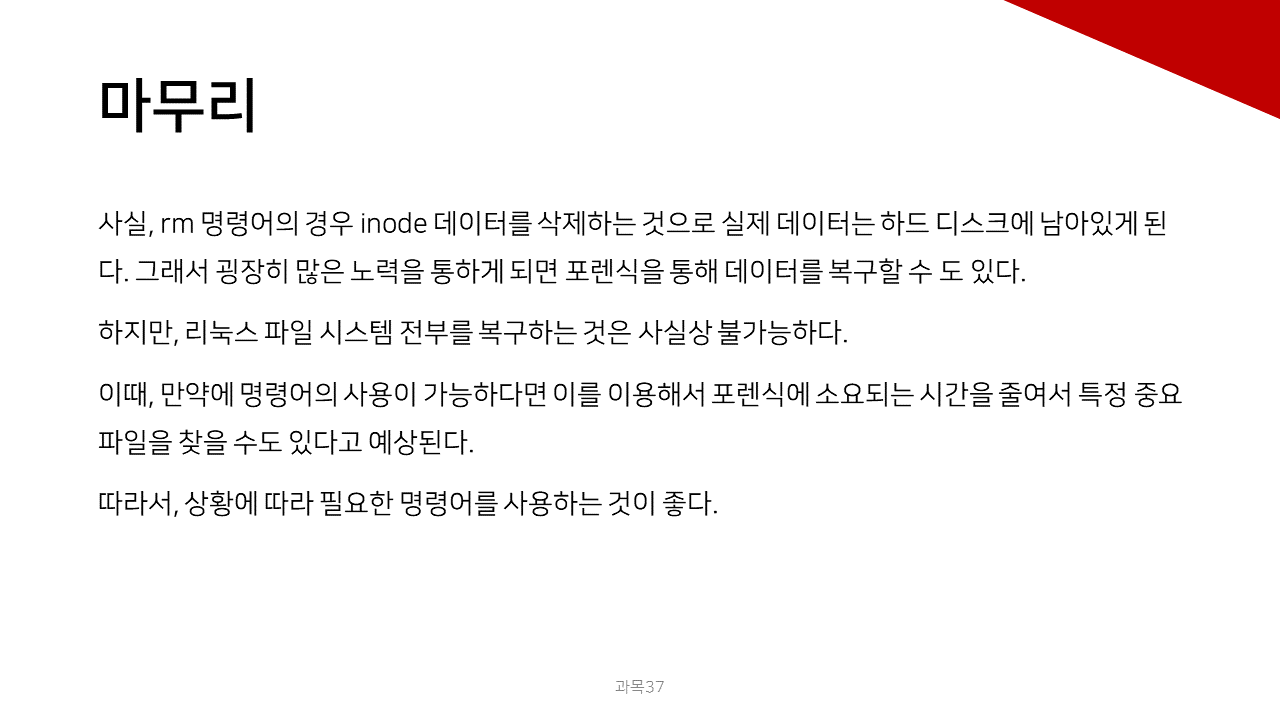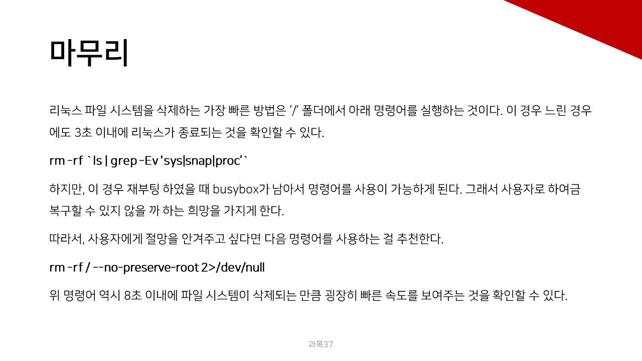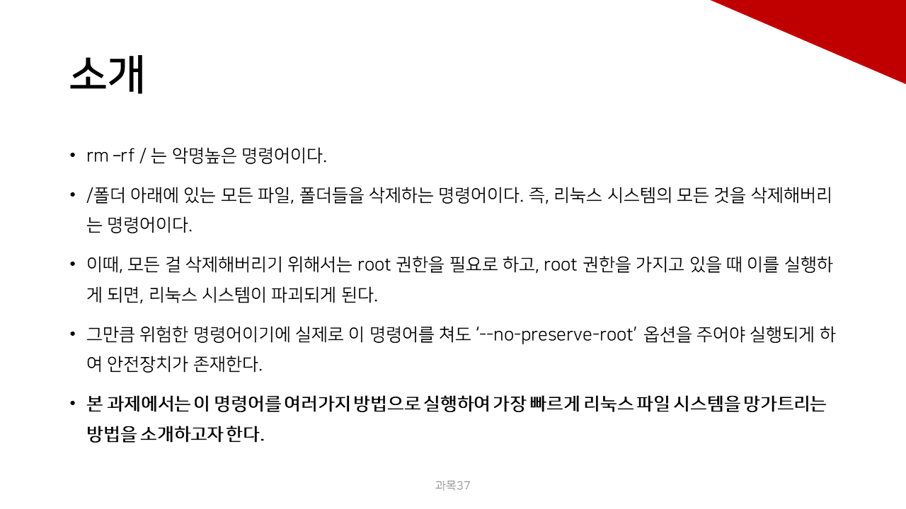 리눅스 명령어중에 rm -rf / 라는 명령어가 있는 데, '/' 폴더 하위의 모든 파일, 폴더를 삭제해버리는 명령어라서 굉장히 악명이 높은 명령어 입니다...