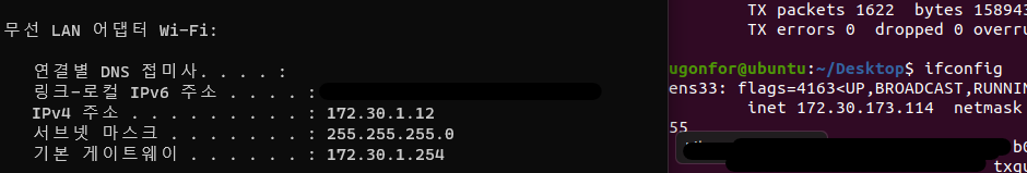 왼쪽이 host, 오른쪽이 우분투 VMWare입니다. 가상머신 설정은 Bridge 모드로 설정해준 상태입니다.