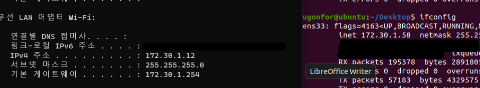 왼쪽이 host, 오른쪽이 우분투 VMWare입니다. 가상머신 설정은 Bridge 모드로 설정해준 상태입니다.