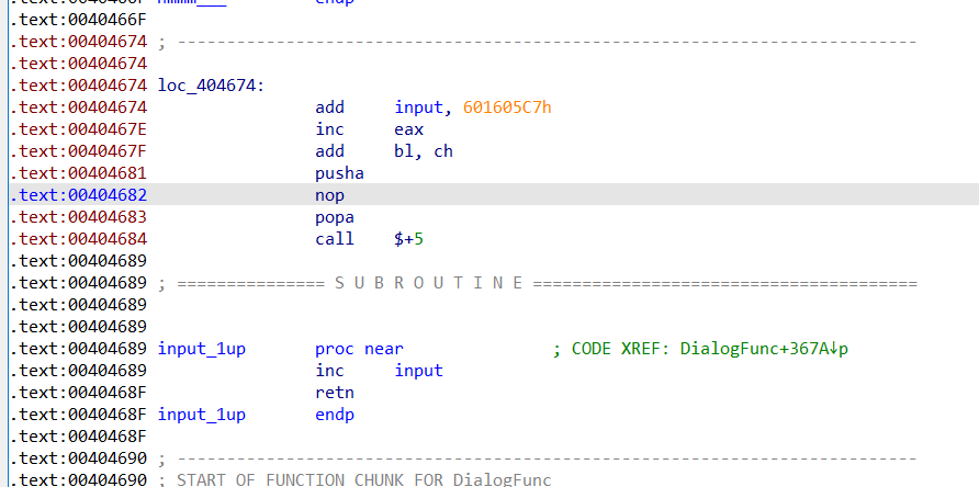가보면 input에다가 601605C7을 더한다. 그다음, eax를 1증가시키고 bl에 ch를 넣고, 모두 push하다가 pop을 하고 난후 다시 input을 1 증가시킨다. 또 아까처럼 input으로 가서 1을 한번 더 증가시킨다. 이후 ret은.... 생각하기 힘드니 디버깅해보자.