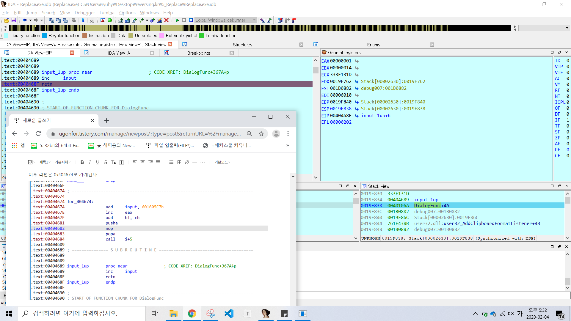 그러니까 정리하자면, input값에다가 0x601605c7을 더하고 4를 더한다. 그 값을 EAX에 넣는다.