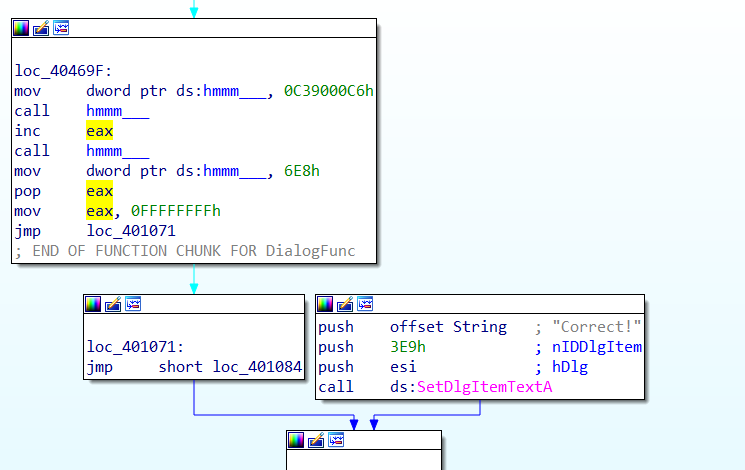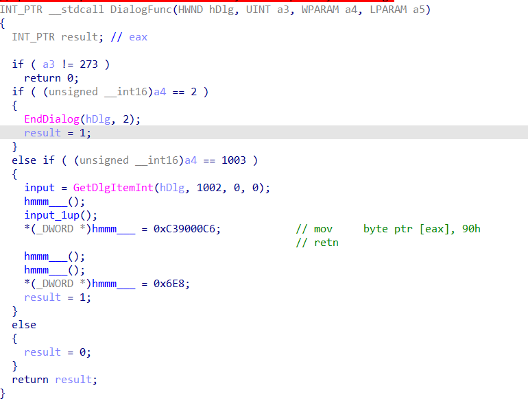 DialogFunc 함수 여기서 보면, 함수가 특별한 점이 있는 데, 함수의 주소를 0xC39000C6으로 바꾸는 것과, 0x6E8로 바꾸어 버리는 부분이다. 그런데 0xC39000c6의 경우 어셈블리 코드로는 eax가 가리키는 곳을 0x90[nop]로 바꾸고 ret하는 것이다.