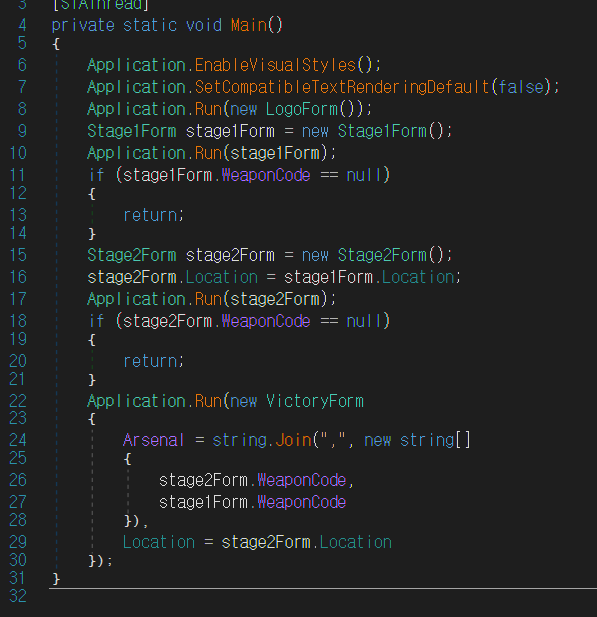 Main()에서 볼 수 있는 것은 Run함수가 있는 데, 매개변수로 LogoForm, stage1Form, stage2Form, VictoryForm이 차례로 있는 것이다. 이는 순서대로 로고창이 보이고, 스테이지1이 보여지며, 코드를 제대로 입력하면 스테이지2가 보여지고, 두번째 코드도 잘 입력하면 victory가 나오는 것일거라 생각된다.