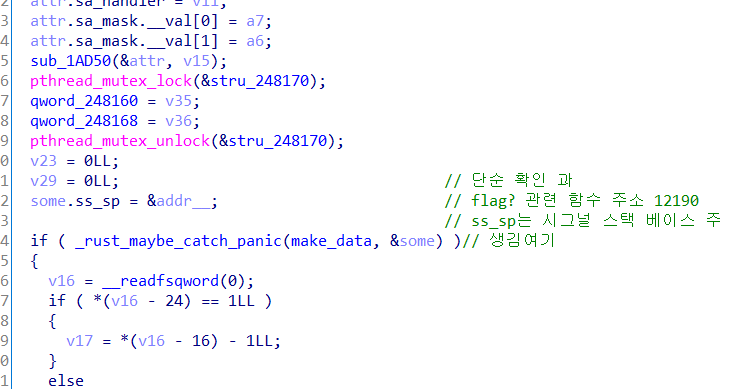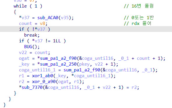 while ( 1 ) // 16번 돌림 { *v37 = sub_ACA0(v35); // 0또는 1반 count = v8; // rdx 들어 if ( !*v37 ) break; if ( *v37 != 1LL ) BUG(); v22 = count; ogat = *sum_pa1_a2_f90(&coga_until16, _0_1 + count + 1); _key = *sum_pa1_a2_250(pkey, v22 + 1); coga_until16_1 = sum_pa1_a2_f90(&coga_until16, _0_1); r1 = xor1_ab0(_key, *coga_until16_1); r2 = xor_0_a90(ogat, r1); *sub_7370(&coga_until16, _0_1 + v22 + 1) = r2; }이 부분이 제일 중요했습니다.