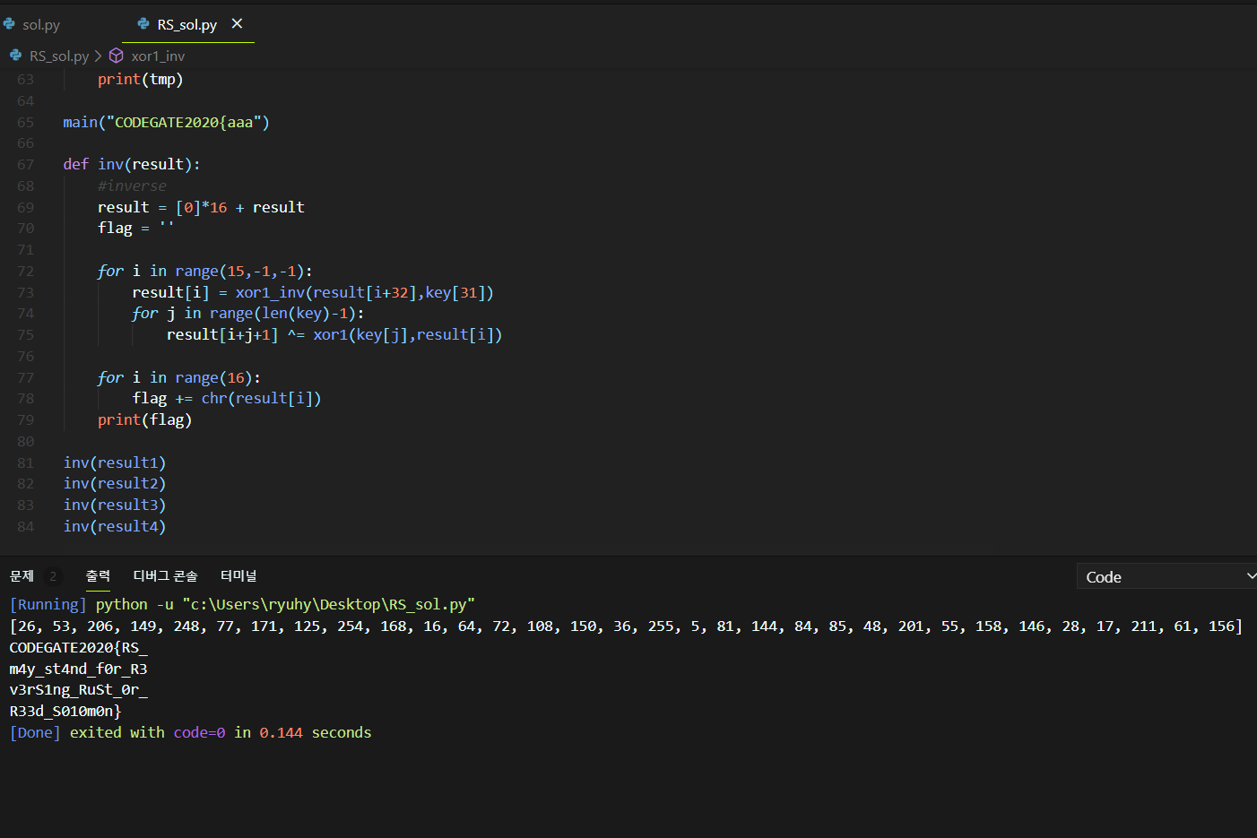 def xor1_inv(r1,keyi): if(r1 == 0): return 0 v4 = ord(keyi) x = [] for i in range(8): x.append(v4) v4 = v4 * 2 if (v4 >= 0x100): v4 ^= 0x11d for i in range(1,256): k = i temp = 0 j = 0 length = i.bit_length() while(k): if(k&1) ==1: temp ^=x[j] j+=1 k>>=1 if(r1 == temp): return (i) def xor1(keyi,flagj): r1 = 0 v4 = ord(keyi) i = (flagj) while i: if (i&1) == 1: r1 ^= v4 v4 *=2 if v4 >= 0x100: v4 ^= 0x11d i >>= 1 return r1 result1 = [0xef ,0x43 ,0x4b ,0x3f ,0x5e ,0xb9 ,0xf0 ,0xd0 ,0x8c ,0xb5 ,0x7e ,0x6f ,0x7b ,0xc8 ,0xa6 ,0x7b ,0x09 ,0xe2 ,0x61 ,0x9d ,0x98 ,0x03 ,0x5f ,0x56 ,0x5d ,0x66 ,0x82 ,0x0b ,0x9e ,0x2b ,0x76 ,0x92] result2 = [0x5b ,0xc3 ,0xdc ,0xf2 ,0x3c ,0xd0 ,0xb6 ,0x81 ,0x60 ,0x34 ,0xa5 ,0x66 ,0xca ,0xbd ,0x7d ,0x6a ,0x00 ,0xfe ,0xe4 ,0x0b ,0x44 ,0xe1 ,0xba ,0x81 ,0xcb ,0xae ,0x8b ,0x24 ,0x0b ,0xa5 ,0x1f ,0x6d] result3 = [0xba ,0x0e ,0x61 ,0x1a ,0x30 ,0xa7 ,0x77 ,0x51 ,0x23 ,0x41 ,0xa6 ,0x1a ,0xc0 ,0x7f ,0x71 ,0x71 ,0x9f ,0xd5 ,0x93 ,0xe5 ,0x38 ,0xce ,0x52 ,0x8b ,0x25 ,0x86 ,0xb3 ,0x12 ,0xb7 ,0xa7 ,0x1c ,0x43] result4 = [0xb4 ,0x08 ,0x81 ,0x47 ,0xae ,0xd6 ,0x18 ,0x46 ,0xc5 ,0x6b ,0x69 ,0x63 ,0x0b ,0xcc ,0x95 ,0xab ,0x49 ,0x53 ,0x6f ,0xde ,0xbe ,0x2f ,0x2e ,0xd9 ,0x9b ,0xdc ,0xdd ,0x76 ,0x69 ,0xa4 ,0xf0 ,0x58] key = "\x74\x40\x34\xae\x36\x7e\x10\xc2\xa2\x21\x21\x9d\xb0\xc5\xe1\x0c" key += "\x3b\x37\xfd\xe4\x94\x2f\xb3\xb9\x18\x8a\xfd\x14\x8e\x37\xac\x58" #main def main(input): flag = input key = "\x74\x40\x34\xae\x36\x7e\x10\xc2\xa2\x21\x21\x9d\xb0\xc5\xe1\x0c\x3b\x37\xfd\xe4\x94\x2f\xb3\xb9\x18\x8a\xfd\x14\x8e\x37\xac\x58" temp = [0]*48 tmp = [0] * 32 for i in range(len(flag)): temp[i] = ord(flag[i]) flag = temp for j in range(16): for i in range(32): flag[i+j+1] = flag[(i+j+1)] ^ xor1(key[i],flag[j]) tmp[i] = flag[i+j+1] print(tmp) main("CODEGATE2020{aaa") def inv(result): #inverse result = [0]*16 + result flag = '' for i in range(15,-1,-1): result[i] = xor1_inv(result[i+32],key[31]) for j in range(len(key)-1): result[i+j+1] ^= xor1(key[j],result[i]) for i in range(16): flag += chr(result[i]) print(flag) inv(result1) inv(result2) inv(result3) inv(result4)파이썬 코드는 다음 위와 같습니다.