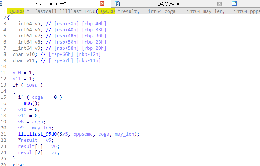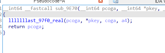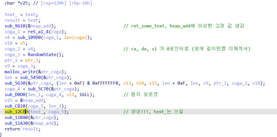 __int64 __fastcall lllllllast_97f0_real(__int64 pcoga, __int64 pkey, __int64 coga, __int64 a4) { __int64 v4; // rdx __int64 v5; // rdx __int64 pcoga_1; // rax __int64 v7; // rdx __int64 v8; // rdx __int64 v9; // rdx __int64 pcoga_2; // rax __int64 v11; // rdx int v12; // edx int v13; // ecx int v14; // er8 int v15; // er9 char r2; // [rsp+26h] [rbp-1C2h] char r1; // [rsp+27h] [rbp-1C1h] unsigned __int8 *coga_until16_1; // [rsp+28h] [rbp-1C0h] unsigned __int8 _key; // [rsp+37h] [rbp-1B1h] char ogat; // [rsp+47h] [rbp-1A1h] __int64 v22; // [rsp+50h] [rbp-198h] _BYTE *v23; // [rsp+90h] [rbp-158h] __int64 _0_1; // [rsp+98h] [rbp-150h] unsigned __int8 n_10h; // [rsp+E7h] [rbp-101h] struct _Unwind_Exception coga_until16; // [rsp+120h] [rbp-C8h] __int64 v27; // [rsp+140h] [rbp-A8h] __int64 v28; // [rsp+148h] [rbp-A0h] int v29[2]; // [rsp+150h] [rbp-98h] __int64 v30; // [rsp+158h] [rbp-90h] int v31[2]; // [rsp+160h] [rbp-88h] int _0[2]; // [rsp+168h] [rbp-80h] __int64 v33; // [rsp+170h] [rbp-78h] __int64 v34; // [rsp+178h] [rbp-70h] int v35[2]; // [rsp+180h] [rbp-68h] __int64 v36; // [rsp+188h] [rbp-60h] int v37[2]; // [rsp+190h] [rbp-58h] __int64 count; // [rsp+198h] [rbp-50h] __int64 _3[3]; // [rsp+1A0h] [rbp-48h] __int64 ppcoga[4]; // [rsp+1B8h] [rbp-30h] ret_a1(coga, a4); ret_a1_5(); sub_C170(&coga_until16); // ret값이 16개로 자른 앞부분 n_10h = ret_0(0); sub_5570(&coga_until16, 0x30uLL, n_10h); v27 = 0LL; v28 = 16LL; *v29 = 0_0(0LL); v30 = v4; while ( 1 ) { *v31 = sub_ACA0(v29); *_0 = v5; if ( !*v31 ) break; if ( *v31 != 1LL ) BUG(); _0_1 = *_0; v23 = sum_pa1_a2_f90(&coga_until16, *_0); if ( ~sub_A980(v23) ) { v33 = 0LL; v34 = 32LL; *v35 = 0_0(0LL); v36 = v7; while ( 1 ) // 16번 돌림 { *v37 = sub_ACA0(v35); // 0또는 1반 count = v8; // rdx 들어 if ( !*v37 ) break; if ( *v37 != 1LL ) BUG(); v22 = count; ogat = *sum_pa1_a2_f90(&coga_until16, _0_1 + count + 1); _key = *sum_pa1_a2_250(pkey, v22 + 1); coga_until16_1 = sum_pa1_a2_f90(&coga_until16, _0_1); r1 = xor1_ab0(_key, *coga_until16_1); r2 = xor_0_a90(ogat, r1); *sub_7370(&coga_until16, _0_1 + v22 + 1) = r2; } } } pcoga_1 = ret_pa1(&coga_until16); pcoga_2 = sub_A7E0(pcoga_1, v9); sub_CAC0(ppcoga, pcoga_2, v11, 16LL); sub_C130(_3, ppcoga); llllllllast_C190___(pcoga, _3); // (p_1,ppcoga) // 이미 값이 만들어져 있더라... sub_11AD0(&coga_until16, _3, v12, v13, v14, v15); return pcoga; }위처럼 수도코드를 볼 수 있었습니다.