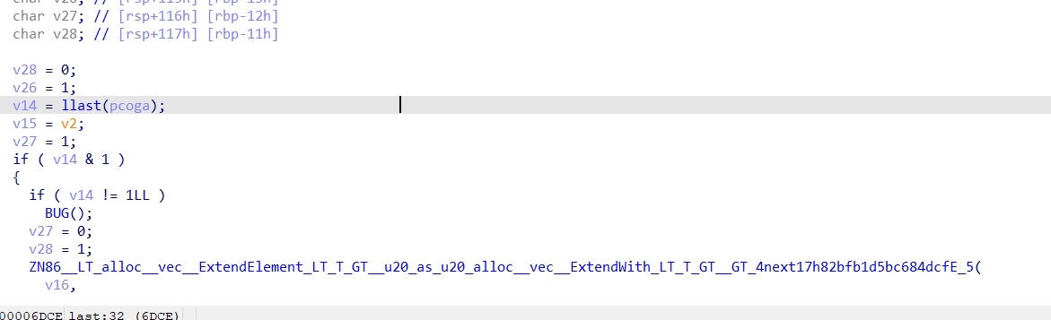 lllast에서는 뭔가 함수가 있길래 무언 가 했더니, pcoga라는 곳에 값이 있는 지 확인을 하더라구요. 그게 아마 바이너리가 16개 블록단위로 암호화를 해서, 반복문이 있고, 한블럭이 끝날 때마다 검사를 하는 것 같습니다.