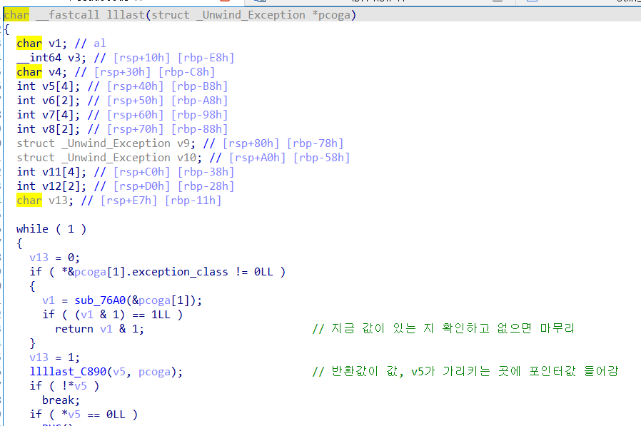 제가 지금 표시해둔 llast함수를 지나는 순간 또 그 요상한 값이 레지스터에 박혀나오더라구요.. 그래서 진짜 마지막함수다 싶어서 llast로 명명하고 또 분석해보는 데... (참고로 llllllllast까지 있어요..)