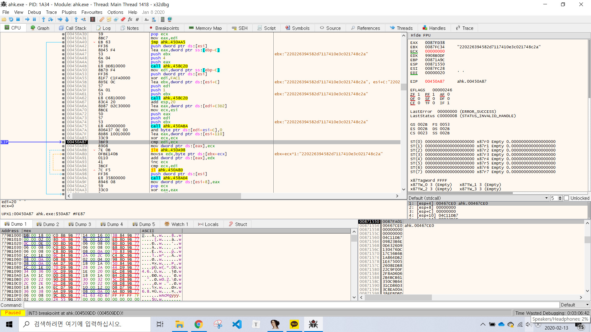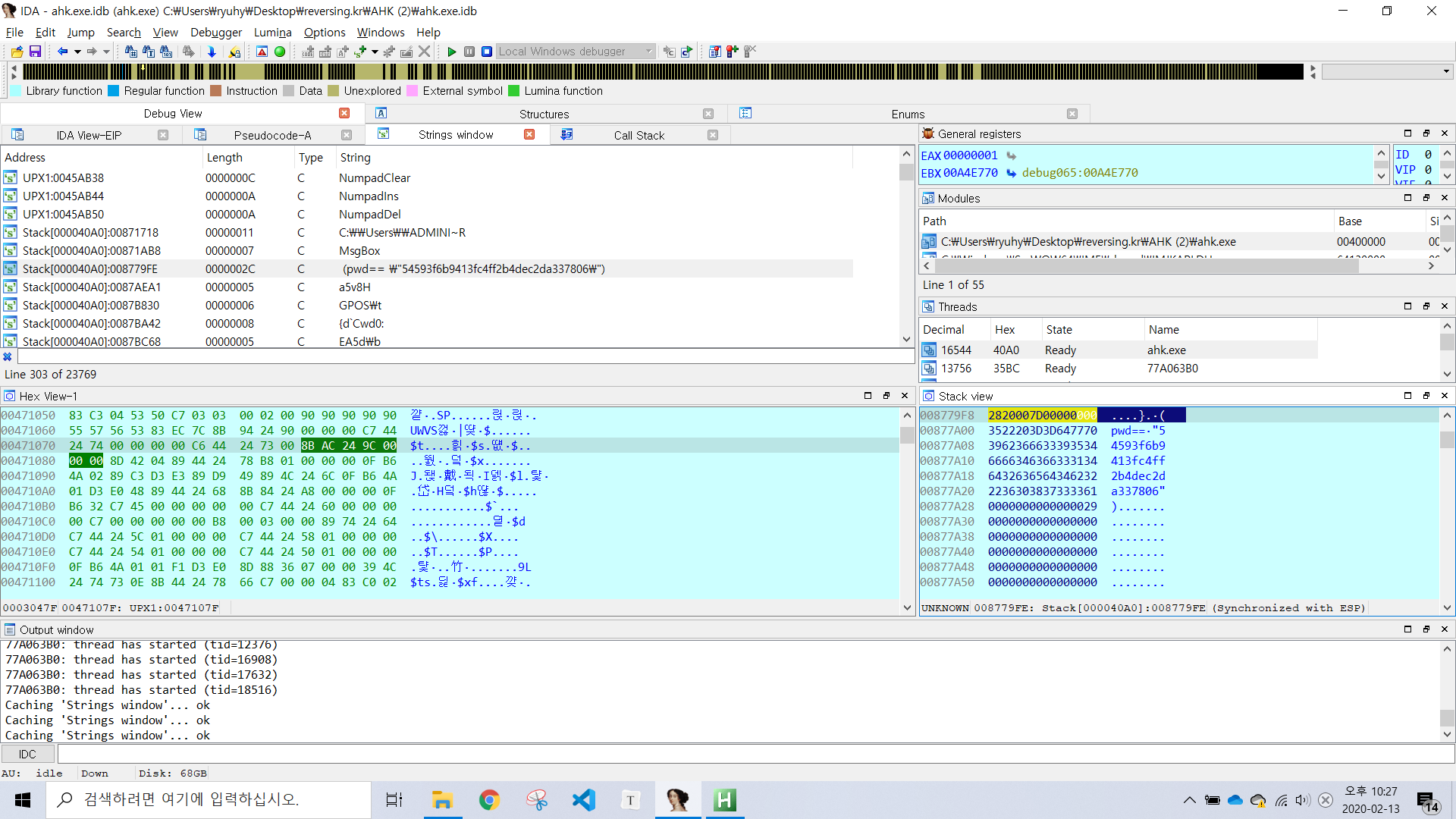 디버깅 상태에서 한번 string 검색을 해보았습니다.