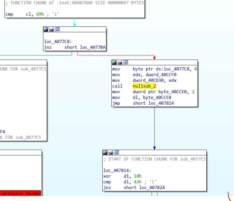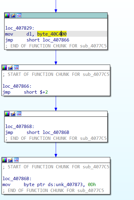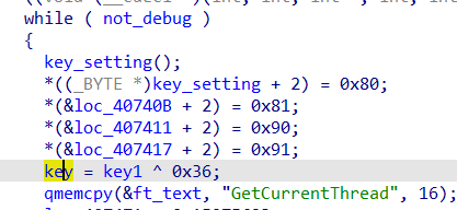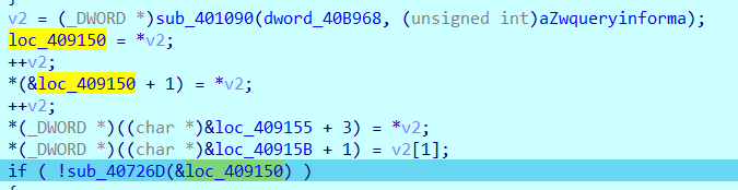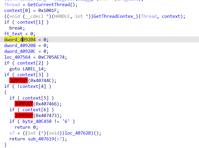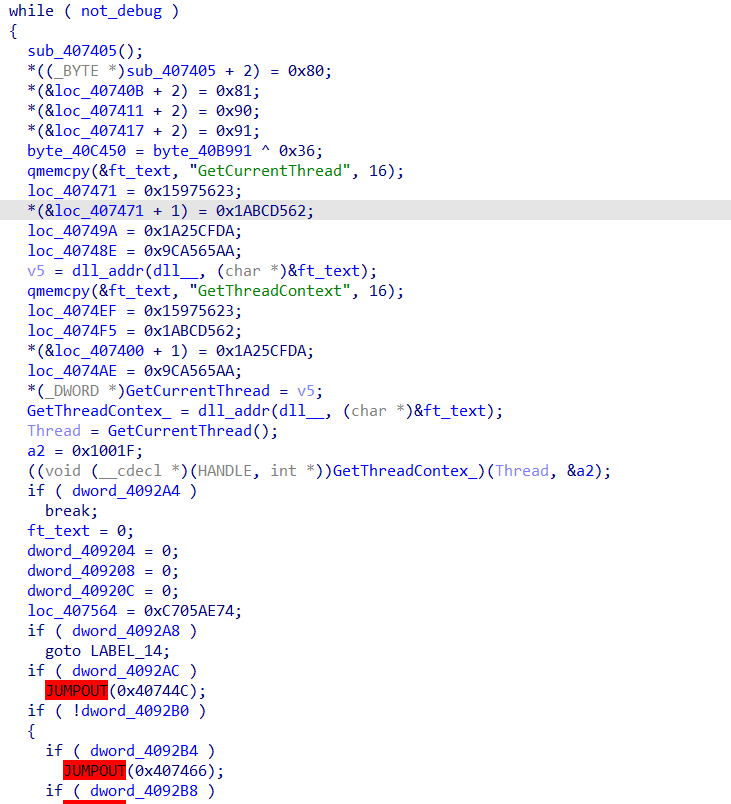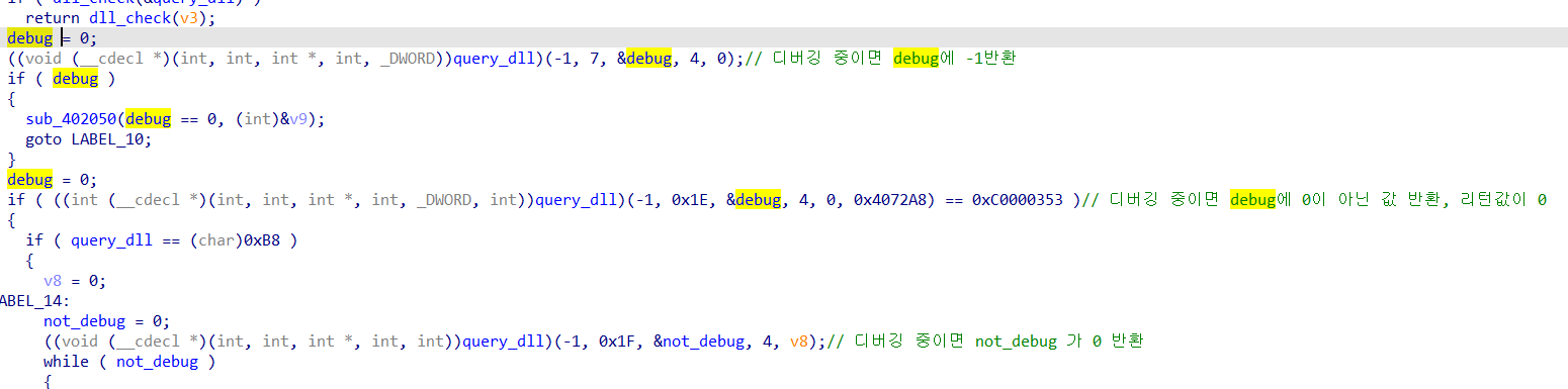 // write access to const memory has been detected, the output may be wrong! // positive sp value has been detected, the output may be wrong! char sub_401240() { int i; // eax char v1; // cl _DWORD *v2; // eax _BYTE *v3; // ecx int v5; // eax HANDLE Thread; // eax char v7; // al int v8; // [esp-70h] [ebp-7Ch] int v9; // [esp-1Ch] [ebp-28h] char v10[12]; // [esp+0h] [ebp-Ch] for ( i = 0; i < 10; ++i ) { v1 = *((_BYTE *)&dword_40B970 + i); if ( !v1 ) break; v10[i] = v1; } v2 = (_DWORD *)dll_addr(ntdll_off, aZwqueryinforma); *(_DWORD *)&query_dll = *v2; ++v2; *((_DWORD *)&query_dll + 1) = *v2; ++v2; *((_DWORD *)&query_dll + 2) = *v2; *((_DWORD *)&query_dll + 3) = v2[1]; if ( dll_check(&query_dll) ) return dll_check(v3); debug = 0; ((void (__cdecl *)(int, int, int *, int, _DWORD))query_dll)(-1, 7, &debug, 4, 0);// 디버깅 중이면 debug에 -1반환 if ( debug ) { sub_402050(debug == 0, (int)&v9); goto LABEL_10; } debug = 0; if ( ((int (__cdecl *)(int, int, int *, int, _DWORD, int))query_dll)(-1, 0x1E, &debug, 4, 0, 0x4072A8) == 0xC0000353 )// 디버깅 중이면 debug에 0이 아닌 값 반환, 리턴값이 0 { if ( query_dll == (char)0xB8 ) { v8 = 0; LABEL_14: not_debug = 0; ((void (__cdecl *)(int, int, int *, int, int))query_dll)(-1, 0x1F, ¬_debug, 4, v8);// 디버깅 중이면 not_debug 가 0 반환 while ( not_debug ) { sub_407405(); *((_BYTE *)sub_407405 + 2) = 0x80; *(&loc_40740B + 2) = 0x81; *(&loc_407411 + 2) = 0x90; *(&loc_407417 + 2) = 0x91; byte_40C450 = byte_40B991 ^ 0x36; qmemcpy(&ft_text, "GetCurrentThread", 16); loc_407471 = 0x15975623; *(&loc_407471 + 1) = 0x1ABCD562; loc_40749A = 0x1A25CFDA; loc_40748E = 0x9CA565AA; v5 = dll_addr(dll__, (char *)&ft_text); qmemcpy(&ft_text, "GetThreadContext", 16); loc_4074EF = 0x15975623; loc_4074F5 = 0x1ABCD562; *(&loc_407400 + 1) = 0x1A25CFDA; loc_4074AE = 0x9CA565AA; *(_DWORD *)GetCurrentThread = v5; GetThreadContex_ = dll_addr(dll__, (char *)&ft_text); Thread = GetCurrentThread(); a2 = 0x1001F; ((void (__cdecl *)(HANDLE, int *))GetThreadContex_)(Thread, &a2); if ( dword_4092A4 ) break; ft_text = 0; dword_409204 = 0; dword_409208 = 0; dword_40920C = 0; loc_407564 = 0xC705AE74; if ( dword_4092A8 ) goto LABEL_14; if ( dword_4092AC ) JUMPOUT(0x40744C); if ( !dword_4092B0 ) { if ( dword_4092B4 ) JUMPOUT(0x407466); if ( dword_4092B8 ) JUMPOUT(0x407473); if ( byte_40C450 != '6' ) return 0; v7 = ((int (*)(void))loc_40762B)(); return sub_407619(v7); } } goto LABEL_11; } LABEL_10: JUMPOUT(0x407306); } LABEL_11: MEMORY[0xDB402080](); return sub_407405(); }코드는 위와 같다.