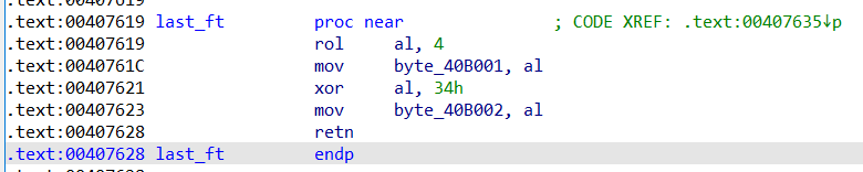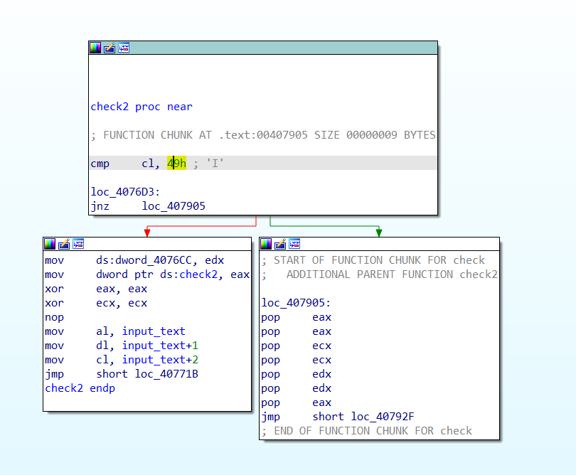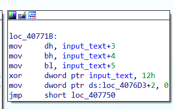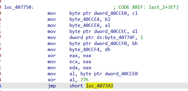 0040760F | A0 90B94000 | mov al,byte ptr ds:[40B990] | 40B990 : input[0] 0040762D | C0C8 06 | ror al,6 | 00407630 | A2 00B04000 | mov byte ptr ds:[40B000],al | 00407619 | C0C0 04 | rol al,4 | 0040761C | A2 01B04000 | mov byte ptr ds:[40B001],al | 00407621 | 34 34 | xor al,34 | 00407623 | A2 02B04000 | mov byte ptr ds:[40B002],al | 00407700 | 8A0D 00B04000 | mov cl,byte ptr ds:[40B000] | 004076D0 | 80F9 49 | cmp cl,49 | 49:'I' 004076E4 | 33C0 | xor eax,eax | 004076E6 | 33C9 | xor ecx,ecx | 004076E9 | A0 70B94000 | mov al,byte ptr ds:[40B970] | 0040B970:"asdfas" : input 004076EE | 8A15 71B94000 | mov dl,byte ptr ds:[40B971] | 0040B971:"sdfas" 004076F4 | 8A0D 72B94000 | mov cl,byte ptr ds:[40B972] | 0040B972:"dfas" 0040771B | 8A35 73B94000 | mov dh,byte ptr ds:[40B973] | 0040B973:"fas" 00407721 | 8A3D 74B94000 | mov bh,byte ptr ds:[40B974] | 0040B974:"as" 00407727 | 8A1D 75B94000 | mov bl,byte ptr ds:[40B975] | 0040772D | 8335 70B94000 12 | xor dword ptr ds:[40B970],12 | 0040B970:"asdfas" 00407750 | 880D E0CC4000 | mov byte ptr ds:[40CCE0],cl | 00407756 | 881D E4CC4000 | mov byte ptr ds:[40CCE4],bl | 0040775C | A2 E8CC4000 | mov byte ptr ds:[40CCE8],al | 00407761 | 8815 ECCC4000 | mov byte ptr ds:[40CCEC],dl | 00407771 | 883D F0CC4000 | mov byte ptr ds:[40CCF0],bh | 00407777 | 8835 F4CC4000 | mov byte ptr ds:[40CCF4],dh | 0040777D | 33C0 | xor eax,eax | 0040777D | 33C0 | xor eax,eax | 0040777F | 8BC8 | mov ecx,eax | 00407781 | 8BD0 | mov edx,eax | 00407783 | A0 E0CC4000 | mov al,byte ptr ds:[40CCE0] | 00407788 | 34 77 | xor al,77 | 004077A3 | 3C 35 | cmp al,35 | 35:'5' 00407800 | 8B0D ECCC4000 | mov ecx,dword ptr ds:[40CCEC] | 00407806 | 890D 80CD4000 | mov dword ptr ds:[40CD80],ecx | 0040780C | 8B0D 80CD4000 | mov ecx,dword ptr ds:[40CD80] | 004077AC | 80F1 20 | xor cl,20 | 004077C5 | 80F9 69 | cmp cl,69 | 69:'i' 004077D1 | 8B15 F0CC4000 | mov edx,dword ptr ds:[40CCF0] | 004077D7 | 8915 30CD4000 | mov dword ptr ds:[40CD30],edx | 004077EC | 8A15 E8CC4000 | mov dl,byte ptr ds:[40CCE8] | 00407814 | 80F2 10 | xor dl,10 | 00407817 | 80FA 43 | cmp dl,43 | 43:'C'하아....