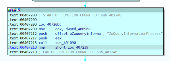 이 부분의 결과값으로 ntdll_NtQueryInformationProcess 를 받길래 찾다 보니 위 블로그에서 본 안티 디버깅 기법이 들어간 것 같다.