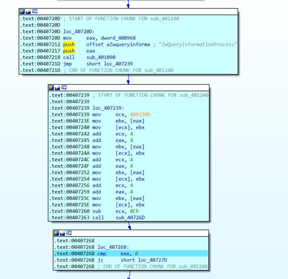 이 부분들이다. 이 부분들은 ntdll_NtQueryInformationProcess 함수를 이용해서 안티 디버깅을 해둔 것으로 아까 위에서 참고할 만한 블로그들을 올려두었다.