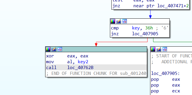 여기서 맨위에 함수 key_setting이라고 명명해 둔곳에서 정해지더군요.. (참고로 위에 사진에서는 그냥 함수 주소로 써져있음) key라고 되어있는 거의 경우에는 위 사진에서 6이랑 비교하는 값이고, 그 값을 xor해주길래 xor해주는 값을 key1이라 했습니다. 또, 2개 위 사진에서 mov al, key2 해주는 변수 key2라 해줬고요.