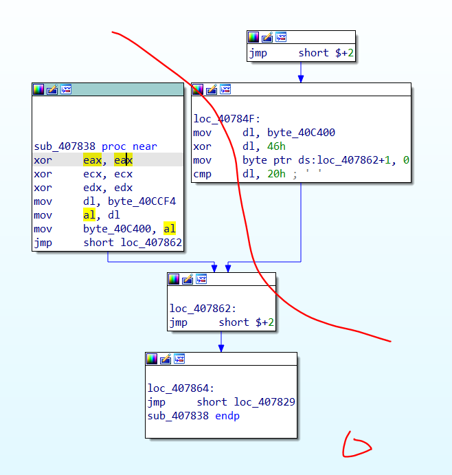 00407838 | 33C0 | xor eax,eax | 0040783A | 33C9 | xor ecx,ecx | 0040783C | 33D2 | xor edx,edx | 0040783E | 8A15 F4CC4000 | mov dl,byte ptr ds:[40CCF4] | 00407844 | 8AC2 | mov al,dl | 00407846 | A2 00C44000 | mov byte ptr ds:[40C400],al | ? 00407829 | 8A15 00C44000 | mov dl,byte ptr ds:[40C400] | 00407872 | 8A0D 00C44000 | mov cl,byte ptr ds:[40C400] | 00407878 | 880D 01C44000 | mov byte ptr ds:[40C401],cl | 0040787E | 33C0 | xor eax,eax | 00407880 | 33C9 | xor ecx,ecx | 0040778C | 8A0D E4CC4000 | mov cl,byte ptr ds:[40CCE4] | 00407792 | 880D F4CF4000 | mov byte ptr ds:[40CFF4],cl | 0040789E | 58 | pop eax | 0040789F | 59 | pop ecx | 004078A0 | 5A | pop edx | 004078B4 | B9 70AB4000 | mov ecx,twist1.40AB70 | 004078CD | 8901 | mov dword ptr ds:[ecx],eax | 004078BB | 41 | inc ecx | ecx:"w@" 004078BC | 40 | inc eax | 004078D1 | 81F9 00AC4000 | cmp ecx,twist1.40AC00 | ecx:"w@" 004078FD | 33D2 | xor edx,edx | 0040790E | 8A15 01C44000 | mov dl,byte ptr ds:[40C401] | 00407914 | 80F2 21 | xor dl,21 | 00407918 | 80FA 64 | cmp dl,64 | 64:'d' 00407DCE | 8A15 30CD4000 | mov dl,byte ptr ds:[40CD30] | 00407DD4 | 33C0 | xor eax,eax | 00407DD6 | 33FF | xor edi,edi | 00407DD8 | 33C9 | xor ecx,ecx | ecx:"w@" 00407E10 | 33F6 | xor esi,esi | 00407E12 | 52 | push edx | 00407E13 | 58 | pop eax | 00407E14 | 50 | push eax | 00407E15 | 59 | pop ecx | 00407E02 | 80F2 46 | xor dl,46 | 00407DE9 | 52 | push edx | 00407DF6 | 59 | pop ecx | 00407DF7 | 51 | push ecx | 00407E18 | 5A | pop edx | ##이줄 살짝 안 맞는 데 아마도 push edx가 있었을듯 00407E19 | 58 | pop eax | 00407E1A | 3C 08 | cmp al,8 | 00407E1E | 5A | pop edx | 004078A6 | C005 F4CF4000 04 | rol byte ptr ds:[40CFF4],4 | 004078C1 | C605 A6784000 20 | mov byte ptr ds:[4078A6],20 | 20:' ' 00407F6E | 33C0 | xor eax,eax | 00407F77 | 8A15 F4CF4000 | mov dl,byte ptr ds:[40CFF4] | 00407F84 | 80FA 14 | cmp dl,14 |이렇게 추가로 나오네요 ^^... 하.... 진짜 뭣같네요...