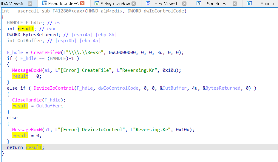 보면 return하는 값이 result인데... 1이려면 OutBuffer가 1이어야 하고,, outBuffer는 DeviceIoControl이어야 하네용...