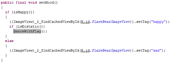 여기서 알 수 있는 것은 setMood()를 isHappy() 조건과 isEcstatic()를 만족시키면 곰돌이가 Flag와 함께 춤을 출 것이다.