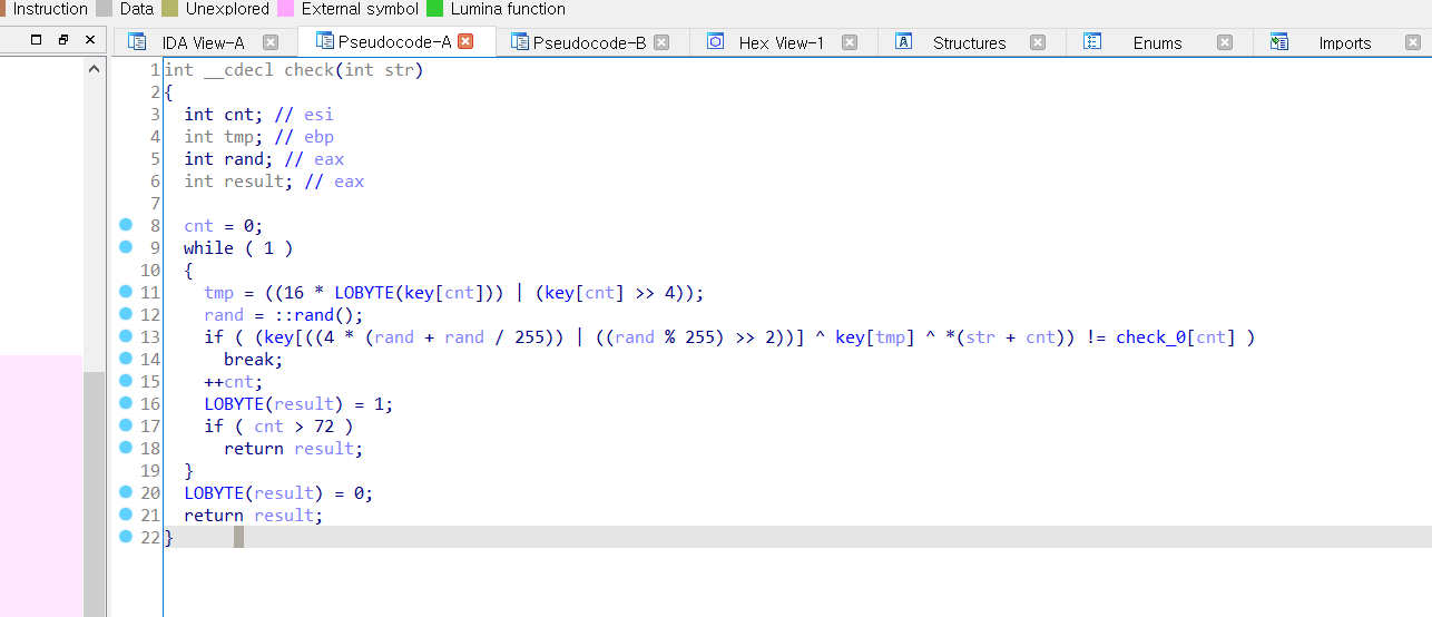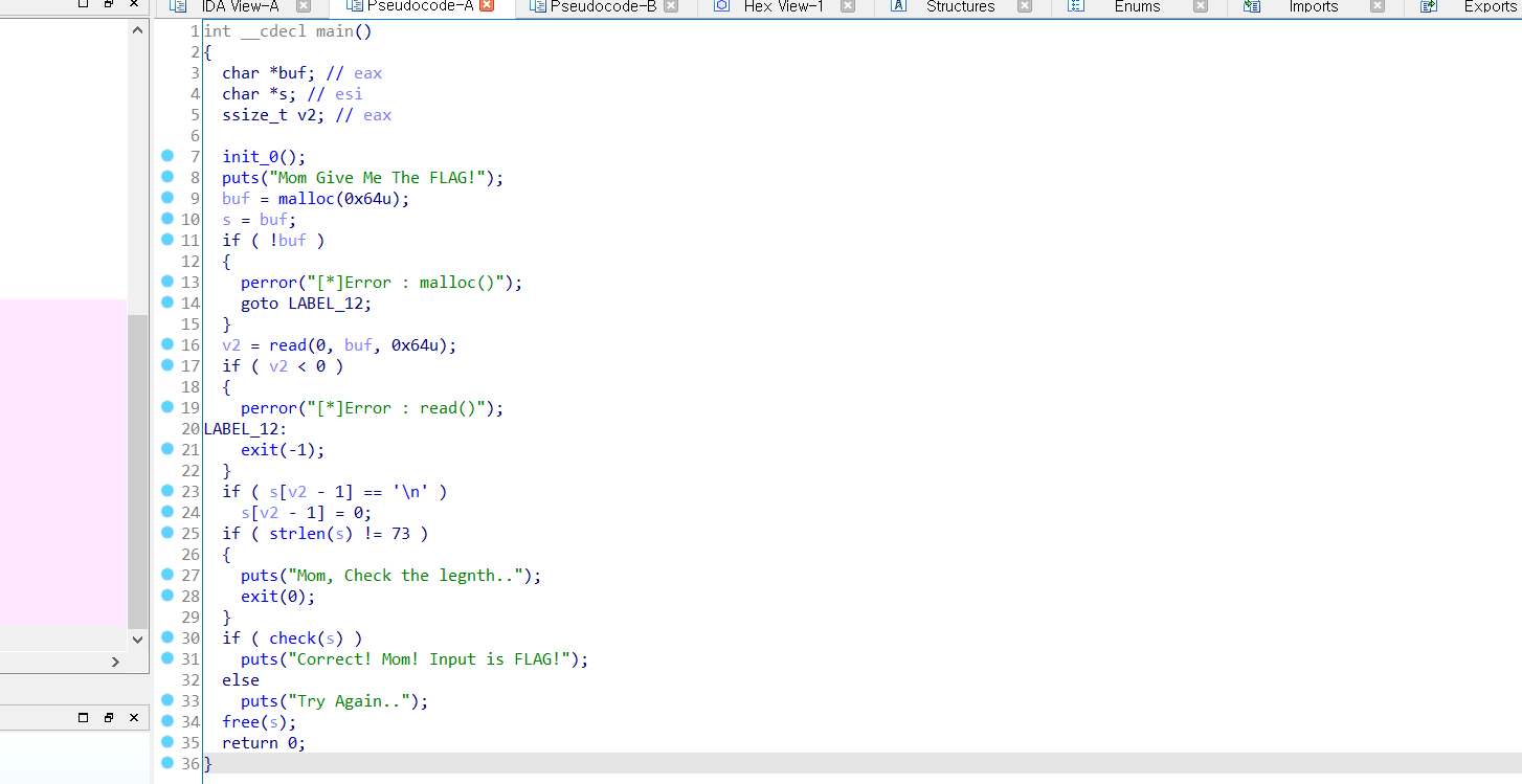 # gdb -n -q -x solmomth.py ./momsTouch import gdb import re key = [186, 28, 4, 248, 59, 168, 156, 124, 142, 152, 129, 137, 9, 85, 208, 238, 197, 253, 71, 80, 162, 70, 223, 99, 46, 81, 56, 254, 106, 242, 160, 90, 148, 229, 73, 98, 55, 31, 121, 216, 84, 28, 229, 104, 187, 240, 96, 100, 15, 73, 205, 125, 169, 253, 2, 125, 202, 3, 50, 128, 197, 75, 61, 233, 116, 141, 61, 138, 44, 178, 48, 120, 196, 0] flag = "0"*73 with open("input", "w") as f: f.write(flag) gdb.execute("break *0x8048812") gdb.execute("start < input") gdb.execute("set *0x8048819 = 0xb0469090") f = "" for i in range(73): ecx = int(re.findall("0x([0-9a-f]+)", gdb.execute("i r $ecx", to_string=True))[0], 16) print(ecx) f += chr((ecx^key[i])^ord("0")) gdb.execute("c") print(f)This problem can be solved by the brute forcing.